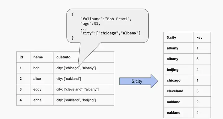 WHERE 'beijing' MEMBER OF $.city;这时我们可以针对 city 这个数组创建多值索引,上述查询就可以利用索引检索符合的记录,大幅提升查询性能。