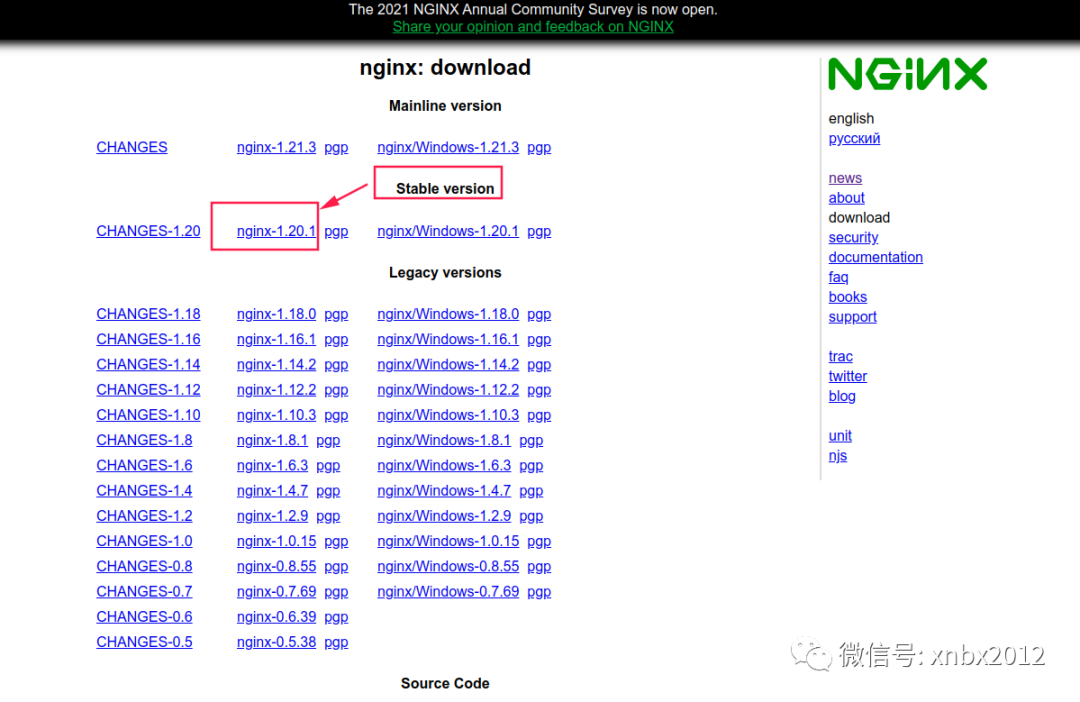访问http://nginx.org/官网下载稳定版nginx包,以笔者为例:打开链接后点击蓝色的