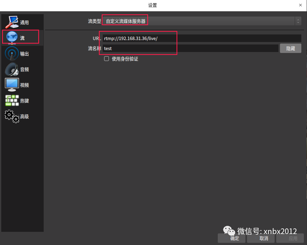 选项卡,选择自定义推流地址,在推流地址中填写rtmp://本地IP地址/live