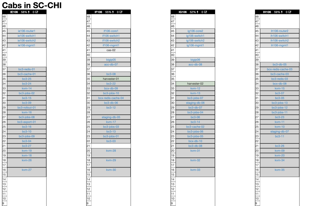 这是我们在芝加哥数据中心四个机柜的示意图(我们在 Ashburn 还有另外四个)。正如你所见,还有一堆专门给 Basecamp 用的老硬件。一旦我们装好新机器,大部分老服务器就该退役了。在下面带有 "kvm" 标记的2U服务器是新家伙: