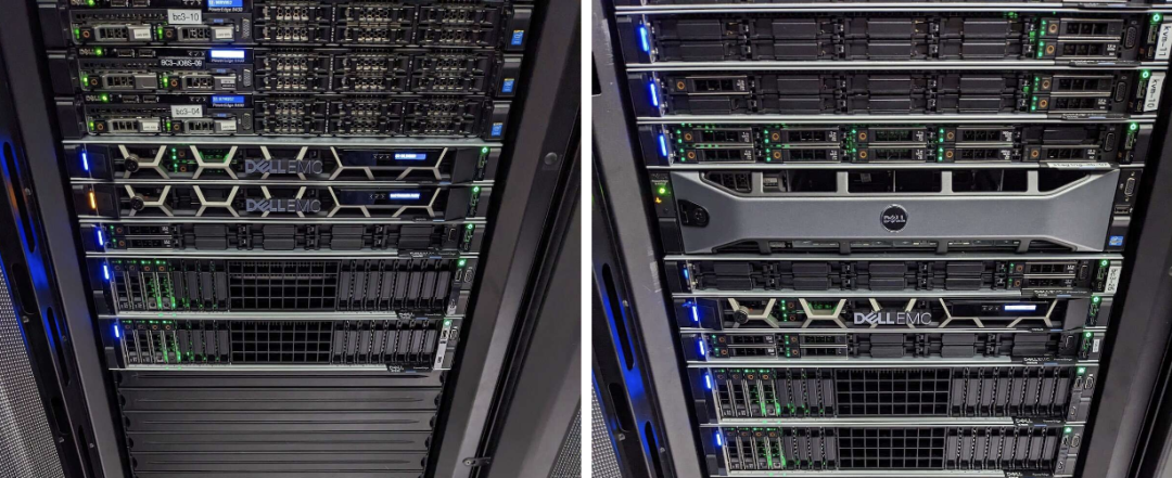 这儿你可以看到新的R7625服务器位于机架底部,挨着旧设备: