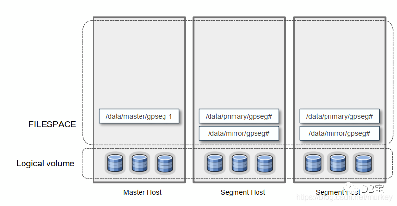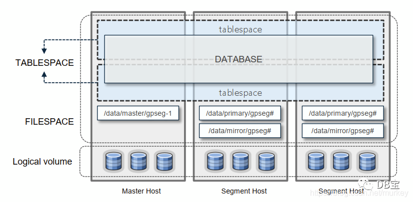 因为在gp中master和segment节点中数据文件肯定得存放在不同的位置,所以我们得想办法将所有的文件系统位置的文件全部都表示起来,因此就引入了文件空间这样一个概念——Greenplum数据库中所有部件所需的文件系统位置集合被称作一个文件空间。文件空间可以被一个或多个表空间使用。