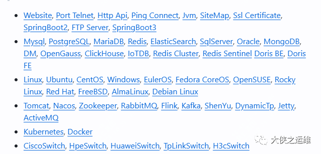 Web服务,如网站,端口,HTTP API,Ping等 数据库,如MySQL,PostgreSQL,Redis,ElasticSearch等 操作系统,如Linux,Windows,Ubuntu等 中间件,如Tomcat,Nacos,Zookeeper,RabbitMQ等 云原生,如Kubernetes,Docker等 网络设备,如CiscoSwitch,HpeSwitch,HuaweiSwitch等