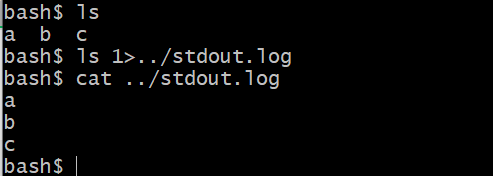 上面的例子我们可以分步执行,看看它们的输入输出都是什么。首先ls的输出是当前目录中的文件,我们把 ls 的标准输出重定向,看下输出文件的内容。