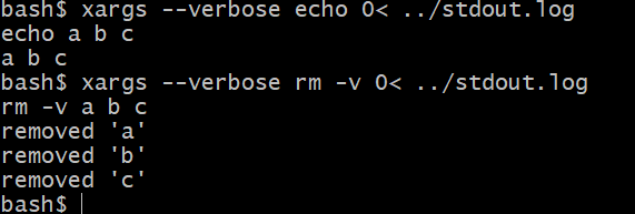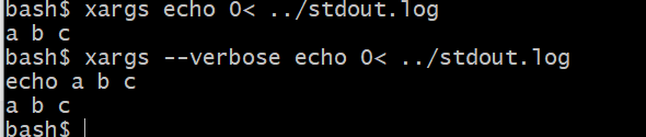 xargs 的功能是将标准输入与它后面接的其它命令拼成完整的命令行,然后执行拼接的命令行。我们通过--verbose参数来看xargs实际的执行命令: