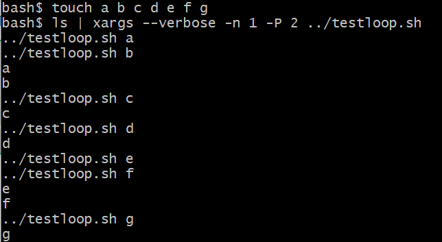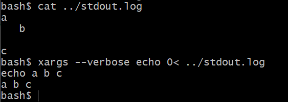 bash$ touch a b cbash$ lsa b cbash$ ls | xargs --verbose echoecho a b ca b c