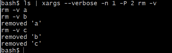 bash$ touch a b cbash$ ls | xargs --verbose -n 1 rmrm arm brm c