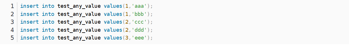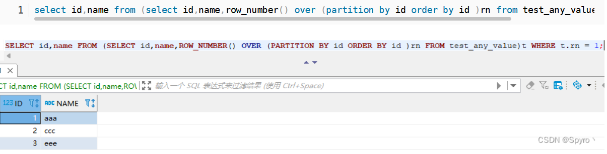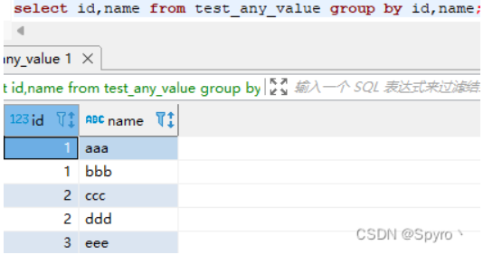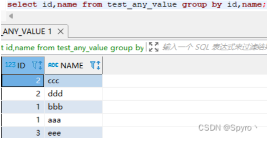 从图中可以看出,any_value函数在ONLY_FULL_GROUP_BY模式开启的情况下,按照id分组后,若每个分组对应多条数据,则会自动选择展示每个分组的第一条数据。