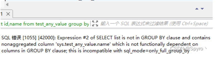 参数ONLY_FULL_GROUP_BY默认开启时,若select列表中的字段与group by后的字段不全相同,则会报错: