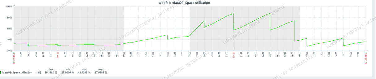 经过查询表空间使用率下降时间点正好是删归档时间点,删归档致使该OS目录可用空间增加。