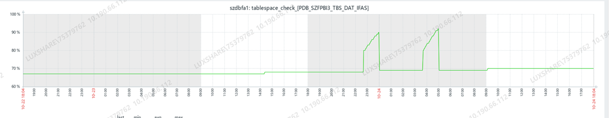 综上所述,该表空间使用率上升再下降原因:归档的增长致使该OS目录剩余空间减少,此时数据文件可自动扩展的最大值大于了OS剩余空间,此时表空间使用率则随着OS目录剩余空间的增减而波动,删归档时OS目录可用空间上升 所以表空间使用率下降。归档删完之后OS目录剩余空间大于了数据文件可自动扩展的最大值。此时tablespace_size为一个定值,所以中间有一段平稳期,但是随着归档的再次增加又出现了第一种情况,随着删归档表空间使用率再次下降。后续扩了2T空间 OS目录可用空间始终大于数据文件可自动扩展的最大值,不再出现表空间使用率异常增长或下降的情况。