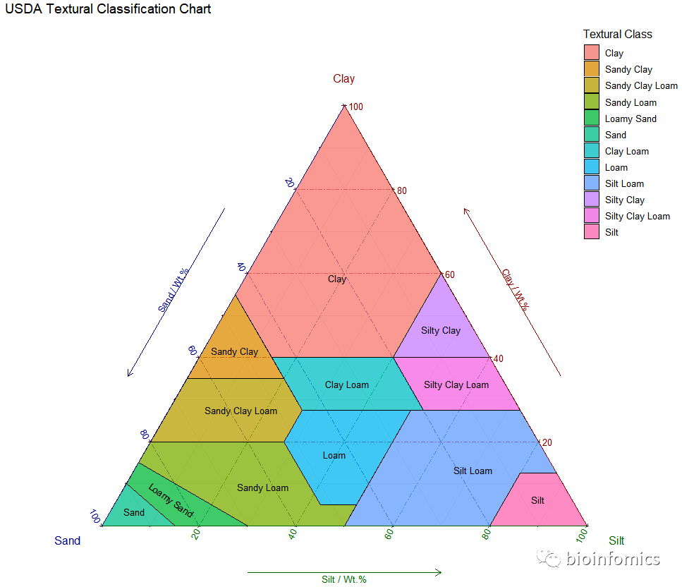 ggtern(data=USDA,aes(Sand,Clay,Silt,color=Label,fill=Label)) +