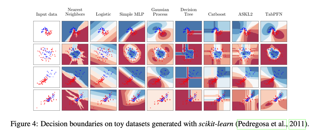 作者首先对TabPFN和标准分类器(无超参数调整)在玩具问题上进行了质量比较。他们使用了包括噪声的moons数据集、包含噪声的circles数据集以及iris和wine数据集的特征。