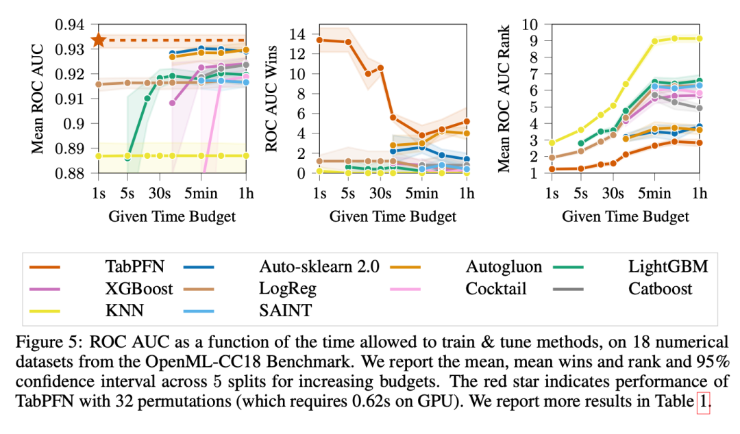 实验结果表明,TabPFN在准确性和训练速度之间取得了更好的平衡。在一个GPU上,TabPFN可以在不到一秒的时间内进行预测,而在训练了一个小时后,其性能与最佳竞争者(AutoML系统)相当。与表格基线方法相比,TabPFN要快得多,但性能相当。总体而言,TabPFN在数据集不包含分类特征或缺失值时表现特别出色。