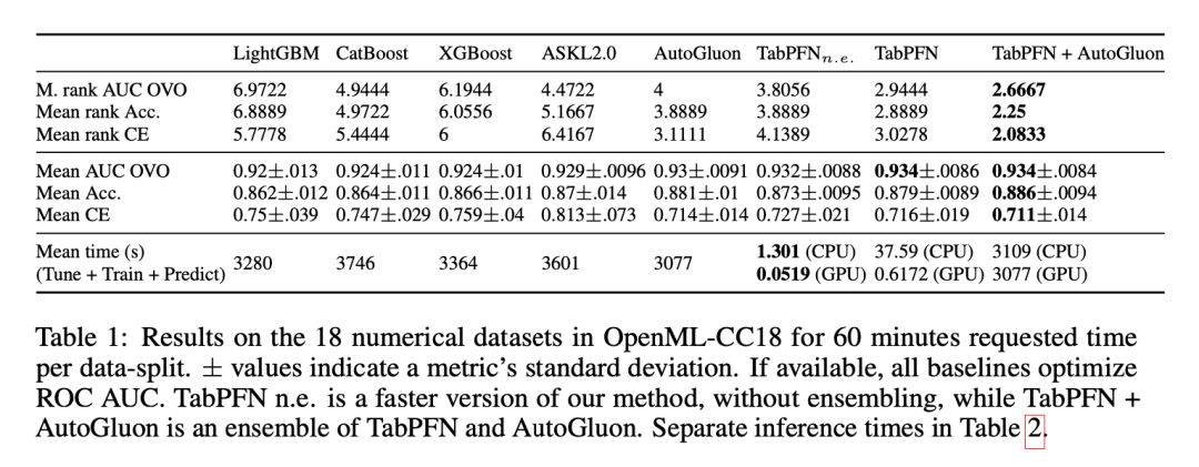 接下来,作者在真实的表格机器学习任务中对TabPFN进行了实证分析,比较了其与表格分类的最先进机器学习方法和AutoML方法。他们使用OpenML-CC18基准测试套件中包含高达2000个样本,100个特征和10个类别的所有数据集作为测试数据集。作者将这些数据集分为18个仅包含数值特征且没有缺失值的数据集和12个包含分类特征和/或缺失值的数据集。