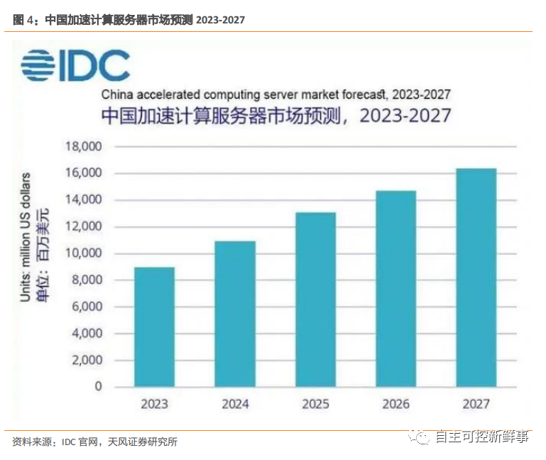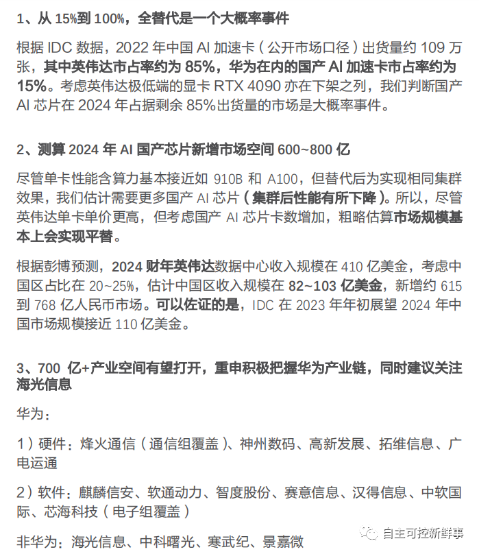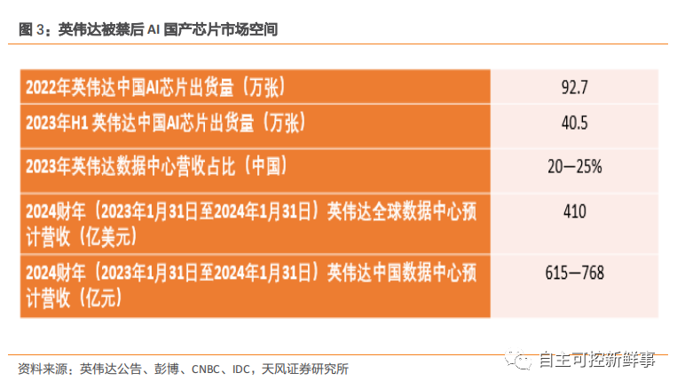 据天风证券测算,2024 年AI国产芯片新增市场空间600~800亿。
