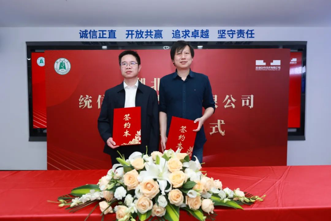 湖北大学党委常委、副校长艾青松与统信软件总经理刘闻欢出席签约仪式。