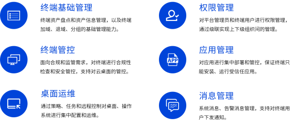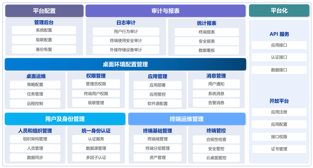 平台通过统一身份认证、人员与终端管理、身份权限管控、系统更新与补丁管理、软件部署与管理、桌面策略配置、审计与报表等核心业务功能,全面覆盖日常运维场景,可实现针对Windows AD域的平滑过渡与最终替代。