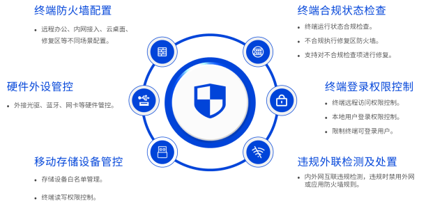 作为首个、也是目前唯一获得《安全操作系统第四级》的桌面操作系统所具备的全栈安全能力,集中域管平台结合大规模终端集中管控的实际需求和业务场景,通过管控策略,实现对统信UOS系统配置、外设管控、合规安全检查及修复、网络安全加固在内的防护体系。