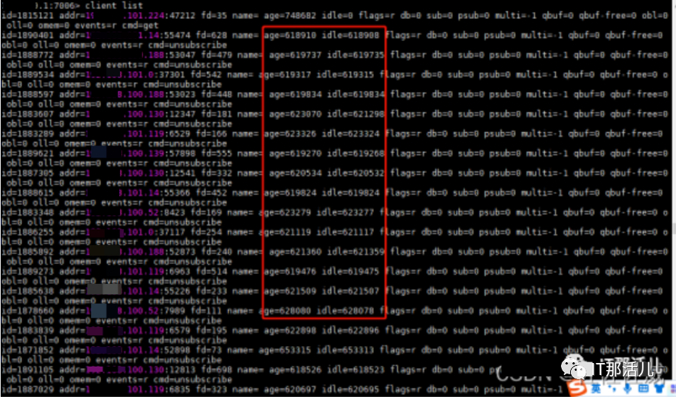 addr:客户端的地址和端口; fd:套接字所使用的文件描述符; age:以秒计算的已连接时长; idle:以秒计算的空闲时长; flags:客户端; flagdb:该客户端正在使用的数据库; IDsub:已订阅频道的数量; psub:已订阅模式的数量; multi:在事务中被执行的命令数量; qbuf:查询缓冲区的长度(字节为单位, 0 表示没有分配查询缓冲区); qbuf-free:查询缓冲区剩余空间的长度(字节为单位, 0 表示没有剩余空间); obl:输出缓冲区的长度(字节为单位, 0 表示没有分配输出缓冲区); oll:输出列表包含的对象数量(当输出缓冲区没有剩余空间时,命令回复会以字符串对象的形式被入队到这个队列里); omem:输出缓冲区和输出列表占用的内存总量; events:文件描述符事件; cmd:最近一次执行的命令。
