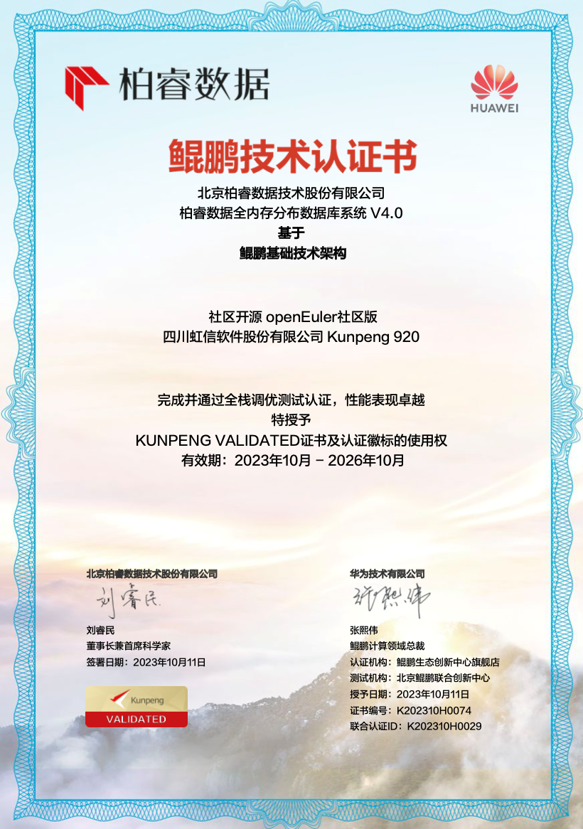 柏睿数据是鲲鹏计算产业生态的重要伙伴,不仅入驻华为鲲鹏智能数据产业联盟,同时企业级交易型数据库Rapids TXDB XC也获得鲲鹏Validated认证。未来,柏睿数据将携手鲲鹏生态创新中心,持续深耕数据智能领域,深度赋能行业创新应用,努力夯实数字中国建设的智能数据算力基座。