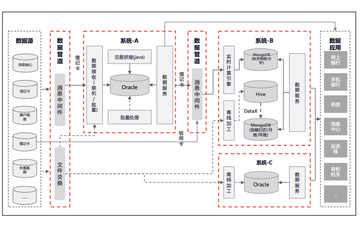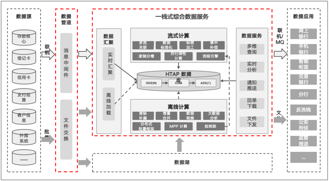 数据服务层:利用 HTAP 数据库的多维度数据访问能力,面向全行内部、外部、合作伙伴提供不同维度、灵活条件的高并发 T+0 数据查询、分析、推送、下发等综合服务。