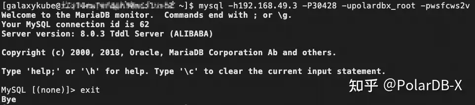 4. 执行如下命令,使用MySQL客户端连接PolarDB-X。验证连接成功。
