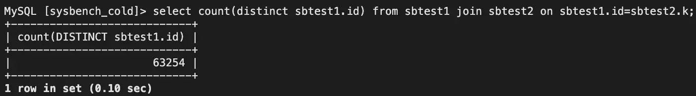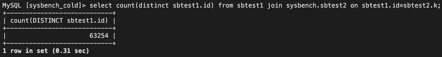 select count(distinct sbtest1.id) from sbtest1 join sysbench.sbtest2 on sbtest1.id=sbtest2.k;