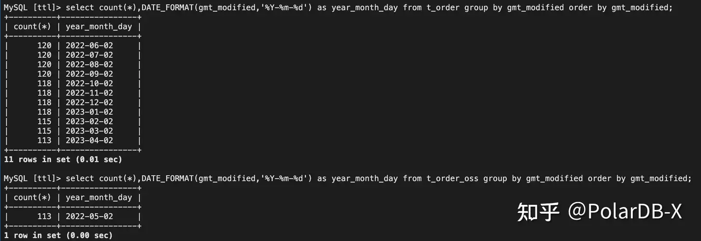 6. 执行如下命令,查看数据分布,p20220601中的5月份数据被归档至冷数据表t_order_oss中。