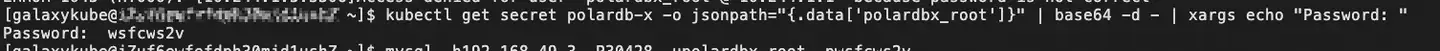 kubectl get secret polardb-x -o jsonpath="{.data['polardbx_root']}" | base64 -d - | xargs echo "Password: "返回结果如下,您可以查看到PolarDB-X集群登录密码
