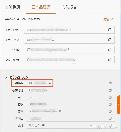 4. 在实验室页面左侧的云产品资源列表中,找到实验室提供的ECS服务器的弹性IP。