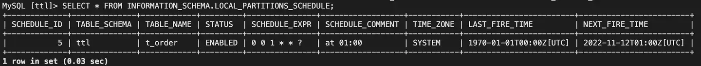 select * from information_schema.local_partitions where table_schema='ttl' and table_name="t_order";所有过期分区均不在原表t_order中,下个分区p20221001到2022-12-01才会过期。