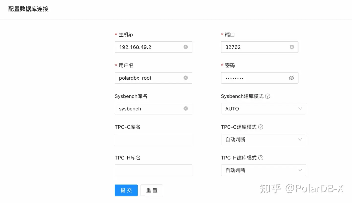 在左侧导航栏进入运行压测-数据库连接面板,在配置数据库连接表格中填入以下信息,然后单击提交。