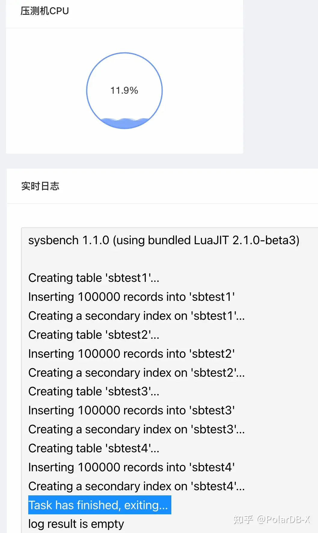 2. 提交导入任务后,可跳转到实时数据-Sysbench面板,查看导入数据过程。当出现Task has finished, exiting...时,表示导入完成。