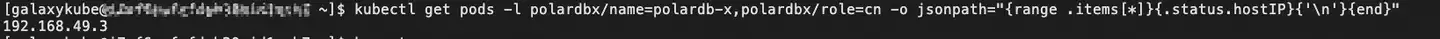 kubectl get pods -l polardbx/name=polardb-x,polardbx/role=cn -o jsonpath="{range .items[*]}{.status.hostIP}{'\n'}{end}" | xargs echo "HostIP:"返回结果如下,您可以查看到PolarDB-X集群地址