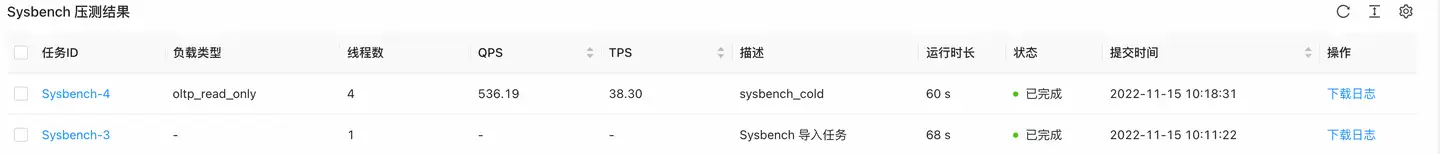进入压测结果-Sysbench面板,可以列表的形式查看历史任务。