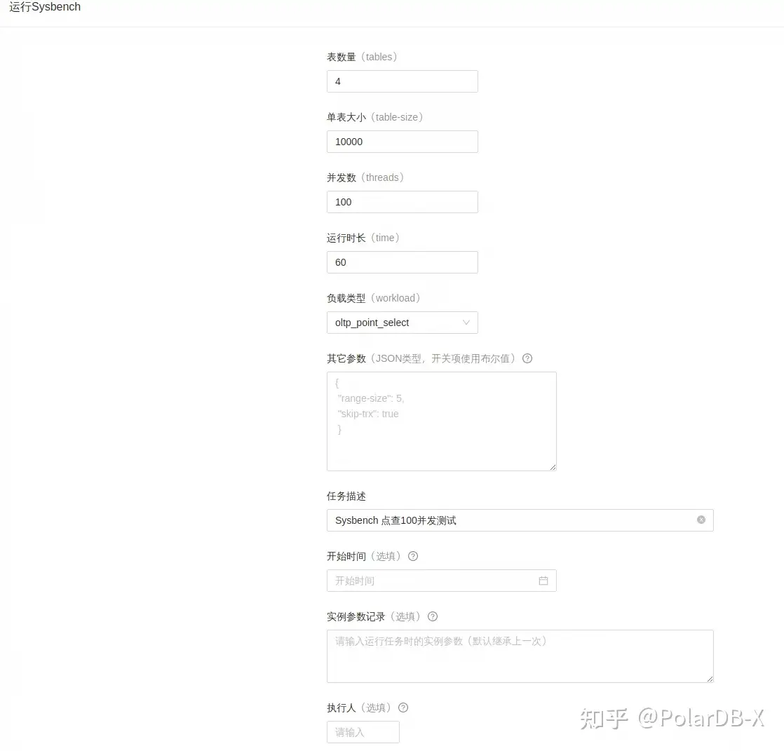 2.1 进入运行压测>Sysbench面板,在运行Sysbench表格中填入以下信息。