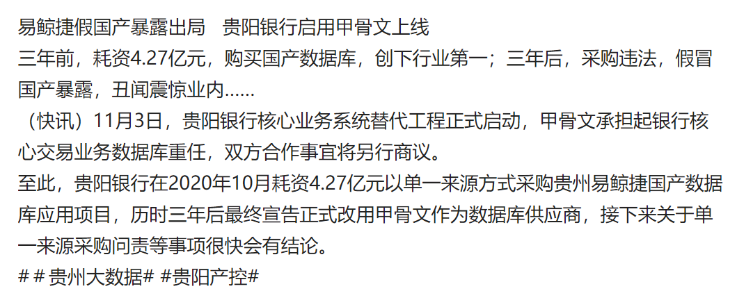 对于骗钱的国产实在是恶劣,今天很多人都看到这个了吧。和4.27亿比起来,Oracle DB2几十万,几百万的怎么好意思和别人打招呼呢?国外一些数据库好意思说自己垄断吗?