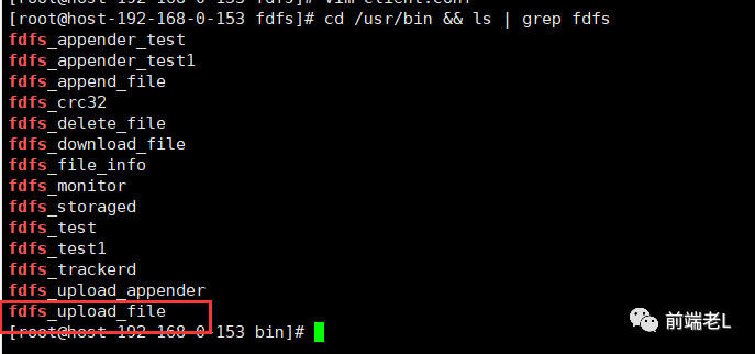 [root@host-192-168-0-153 fdfs]# cd /usr/bin && ls | grep fdfsfdfs_appender_testfdfs_appender_test1fdfs_append_filefdfs_crc32fdfs_delete_filefdfs_download_filefdfs_file_infofdfs_monitorfdfs_storagedfdfs_testfdfs_test1fdfs_trackerdfdfs_upload_appenderfdfs_upload_file[root@host-192-168-0-153 bin]#