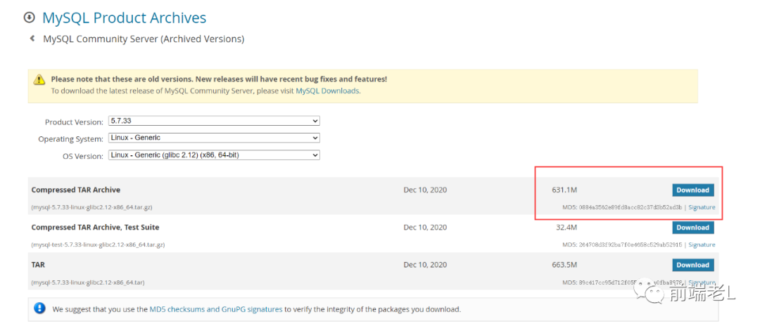在https://downloads.mysql.com/archives/community/下载mysql-5.7.33-linux-glibc2.12-x86_64.tar.gz