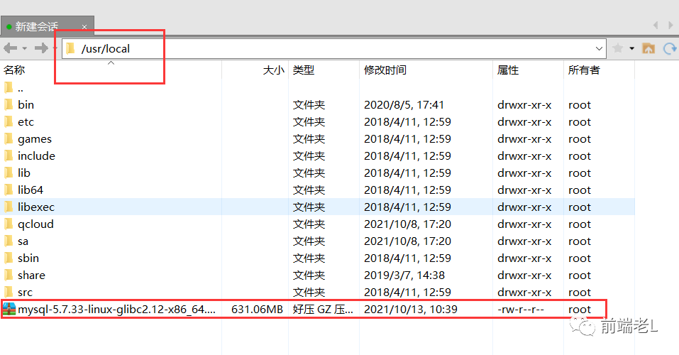 使用xftp将下载好的mysql-5.7.33-linux-glibc2.12-x86_64.tar.gz,上传的Linux中的/usr/local下
