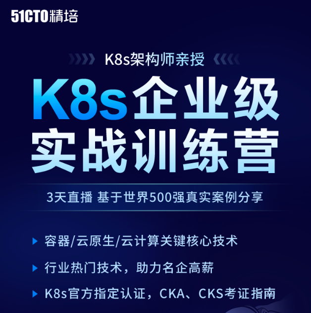 在此,51CTO与资深架构师韩先超联合推出《3天K8s直播训练营》,本课程完全站在小白的角度,包含梳理K8s知识体系、部署K8s(手动安装、自动安装、使用云厂商自带的k8s等)、基于K8s的实战案例分享,讲师专业答疑,赠送精选实战资料和学习指南等,帮助你快速上手云原生时代最重要的技能。学完还可以选择考取CKA和CKS证书,对于想加薪、或者想跳槽的同学可谓一举两得。