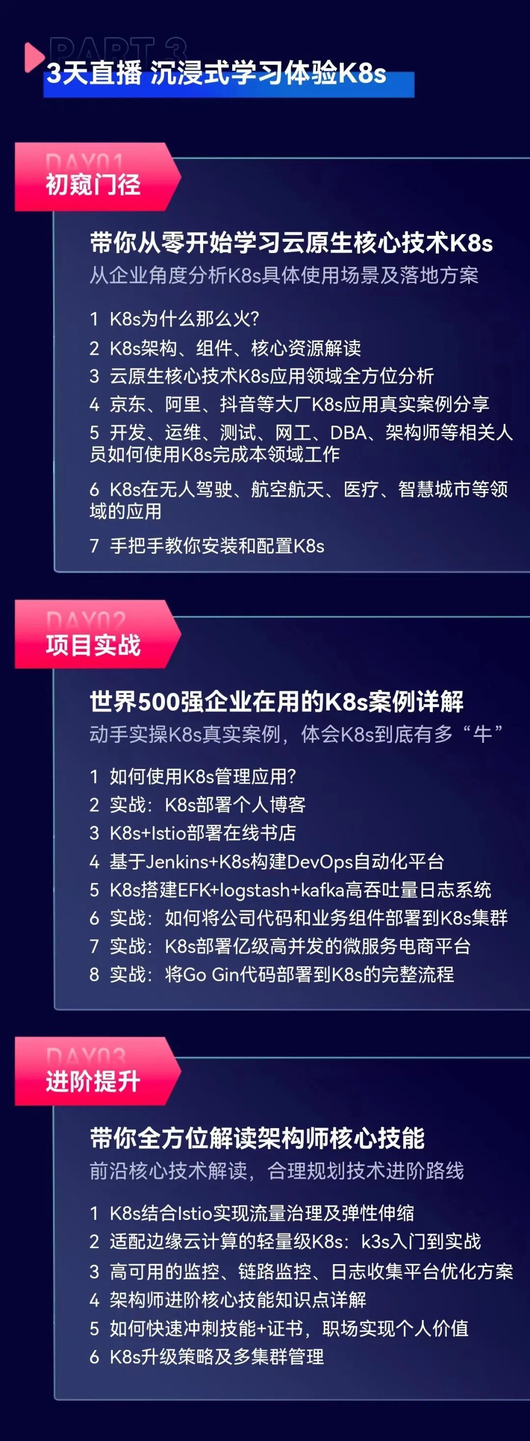 3天课程会介绍Linux和虚拟化、容器、K8S、云原生、云计算之间的关联性,K8s架构、组件、核心资源、应用领域、大厂真实案例、通过K8S可视化UI界面Rancher创建k8s资源,带你实战练习基于K8s构建自动化运维管理平台DevOps、基于Helm一键式部署k8s资源、K8S二次开发、基于K8S实现电商网站自动扩缩容等世界500强实战案例。而且听完课后,还可在群里向韩先超老师提问,有问题当堂解决!非常适合想要快速学习和了解K8s的同学。
