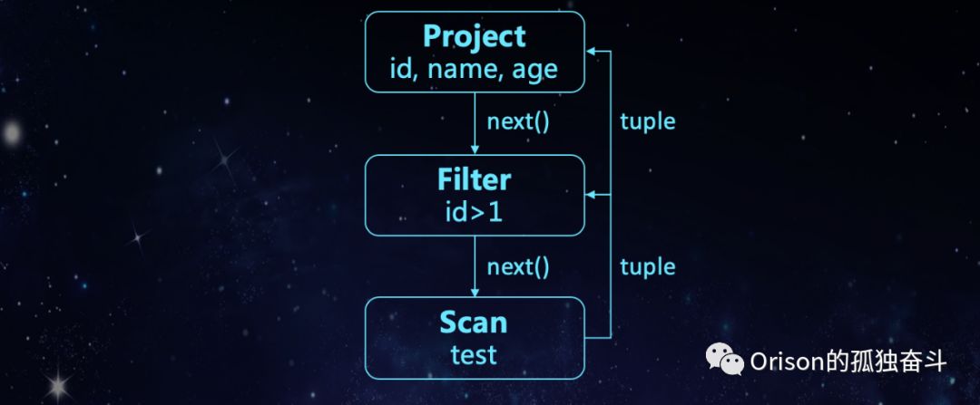 火山模型是一般SQL引擎经常使用的一种模型,还是用上文的例子: