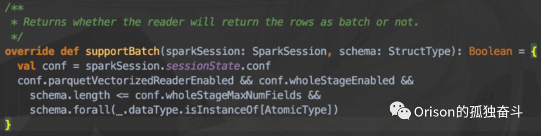 Spark源码中,FileFormat接口有一个方法叫supportBatch(),顾名思义,就是能不能使用nextBatch(),也就是向量化的批量返回。那么在ParquetFileFormat实现类里,是这么继承这个方法的: