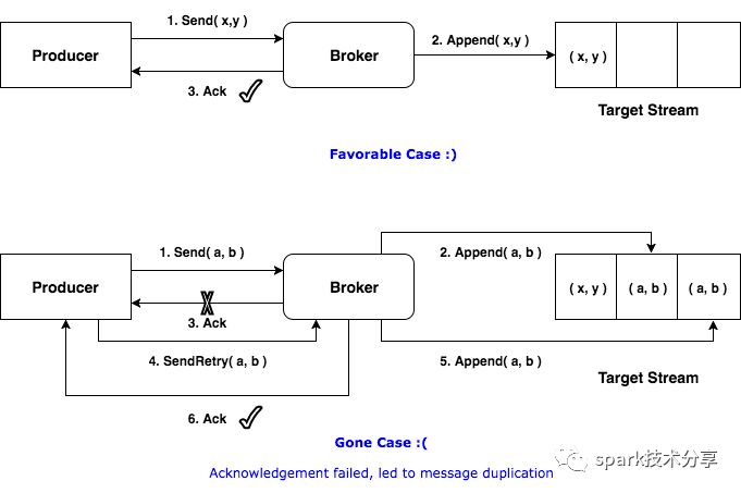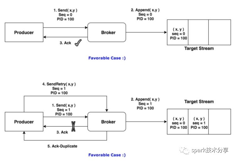 Broker端在缓存中保存了这seq number,对于接收的每条消息,如果其序号比Broker缓存中序号大于1则接受它,否则将其丢弃。这样就可以实现了消息重复提交了。但是,只能保证单个Producer对于同一个<Topic, Partition>的Exactly Once语义。不能保证同一个Producer一个topic不同的partion幂等。