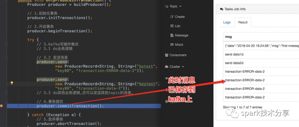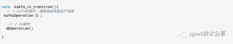 注意:在理解消息的事务时,一直处于一个错误理解就是如下代码中,把操作db的业务逻辑跟操作消息当成是一个事务。其实这个是有问题的,操作DB数据库的数据源是DB,消息数据源是kfaka,这是完全不同两个数据,一种数据源(如mysql,kafka)对应一个事务,所以它们是两个独立的事务:kafka事务指kafka一系列 生产、消费消息等操作组成一个原子操作;db事务是指操作数据库的一系列增删改操作组成一个原子操作。