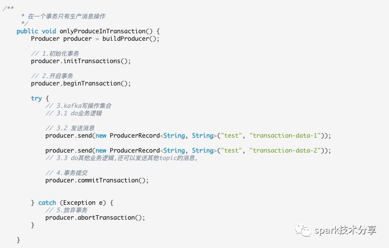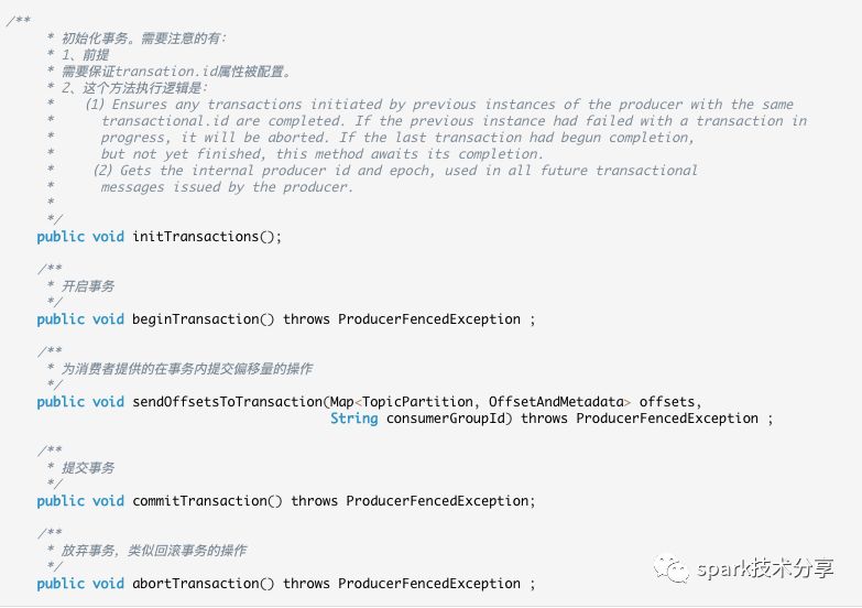 producer提供了initTransactions, beginTransaction, sendOffsets, commitTransaction, abortTransaction 五个事务方法。