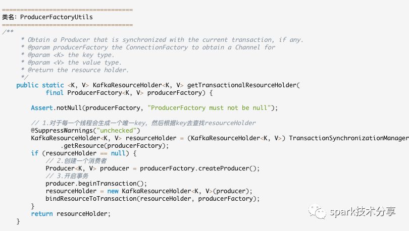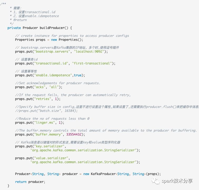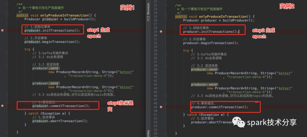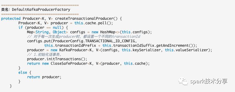 通过上面实例中可以看到kafka是跨Session的数据幂等发送,即如果应用部署多个实例时常会遇到上面的问题“org.apache.kafka.common.errors.ProducerFencedException: Producer attempted an operation with an old epoch. Either there is a newer producer with the same transactionalId, or the producer’s transaction has been expired by the broker.”,必须保证这些实例生成者的提交事务顺序和创建顺序保持一致才可以,否则就无法成功。其实,在实践中,我们更多的是如何实现对应用单实例的事务性。可以通过spring-kafaka实现思路来学习,即每次创建生成者都设置一个不同的transactionId的值,如下代码: