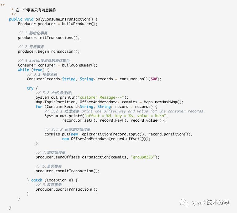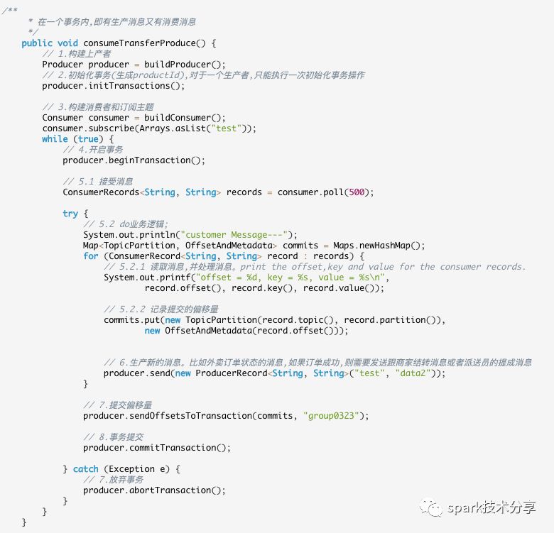 在一个事务中,既有生产消息操作又有消费消息操作,即常说的Consume-tansform-produce模式。如下实例代码